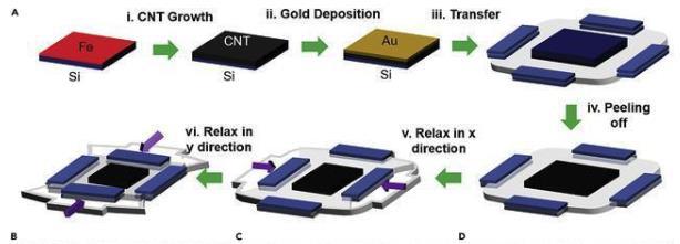 然后,将其金色朝下放置在一个弹性基材上,该基材在张力下可拉伸至其正常长度的四倍。一旦打开,张力就释放了,整个东西皱了起来,以更高的密度将“森林”中的纳米管“树”挤在一起。最后,在纳米管“森林”中填充凝胶电解质,该电解质能够在纳米管表面捕获电子。在这一点上,把两个电极夹在一起,施加一个电压,把所有的电子从一边传送到另一边,在那里电子可以储存起来,然后作为能量释放出来。