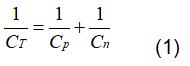 在超级电容器中,每一个电极都是一个电容。所以,对于超级电容器来说,总电容由正负极两个电容器串联而得。如果将正极电容用Cp来表示,负极电容用Cn来表示,则总电容为 :